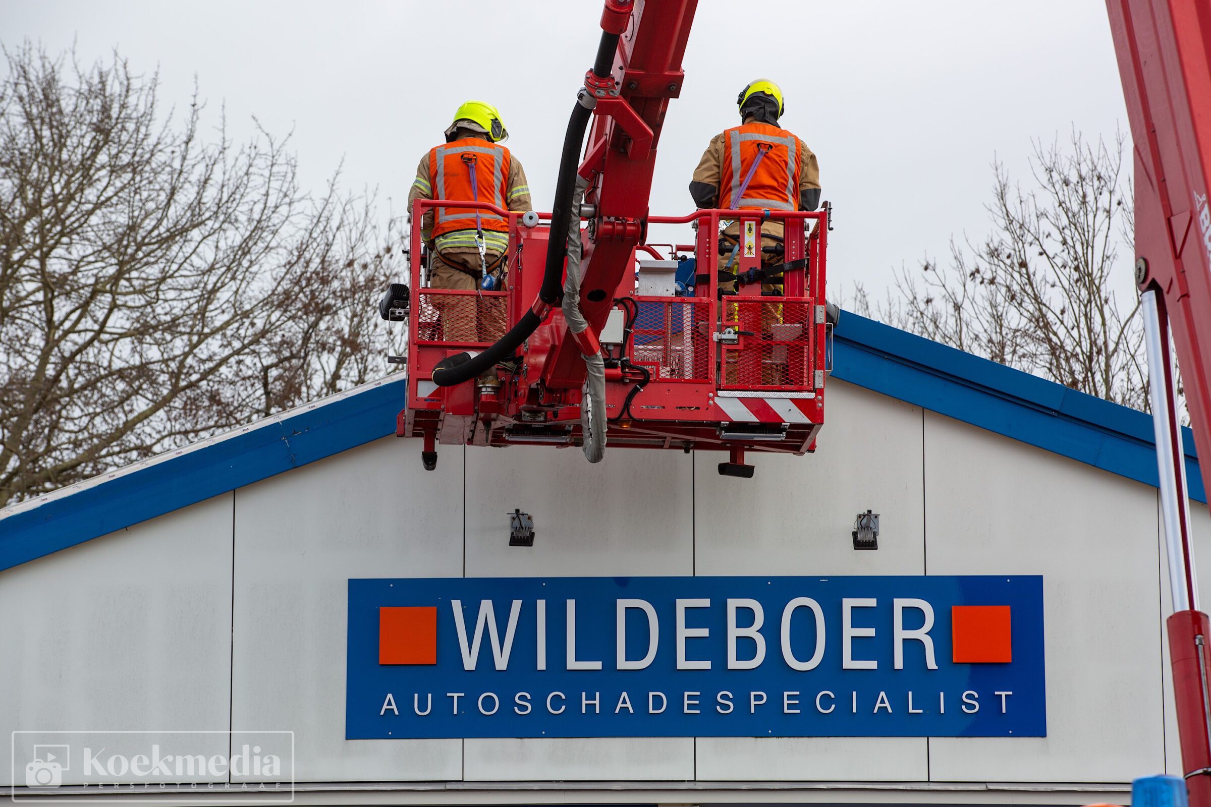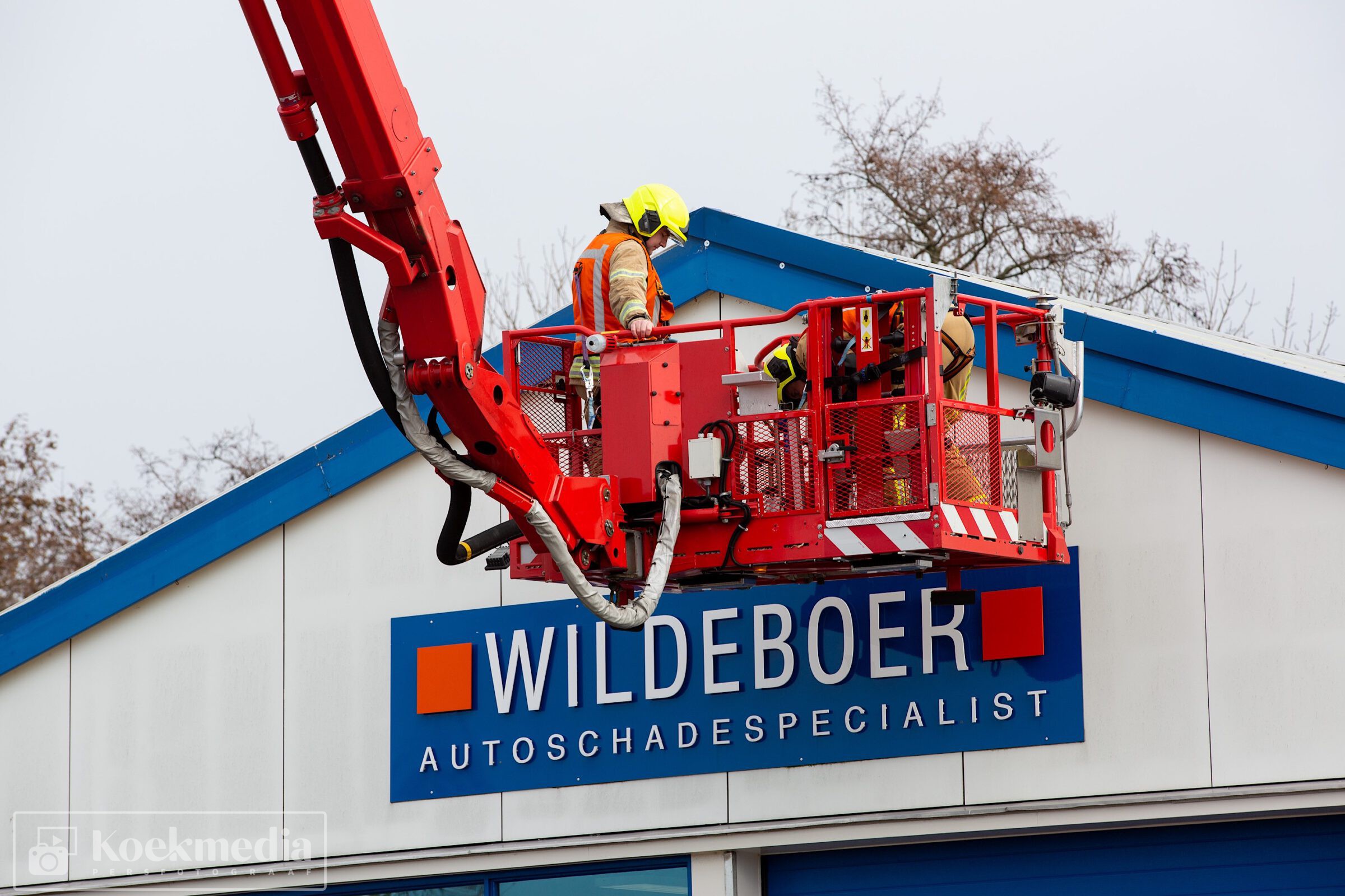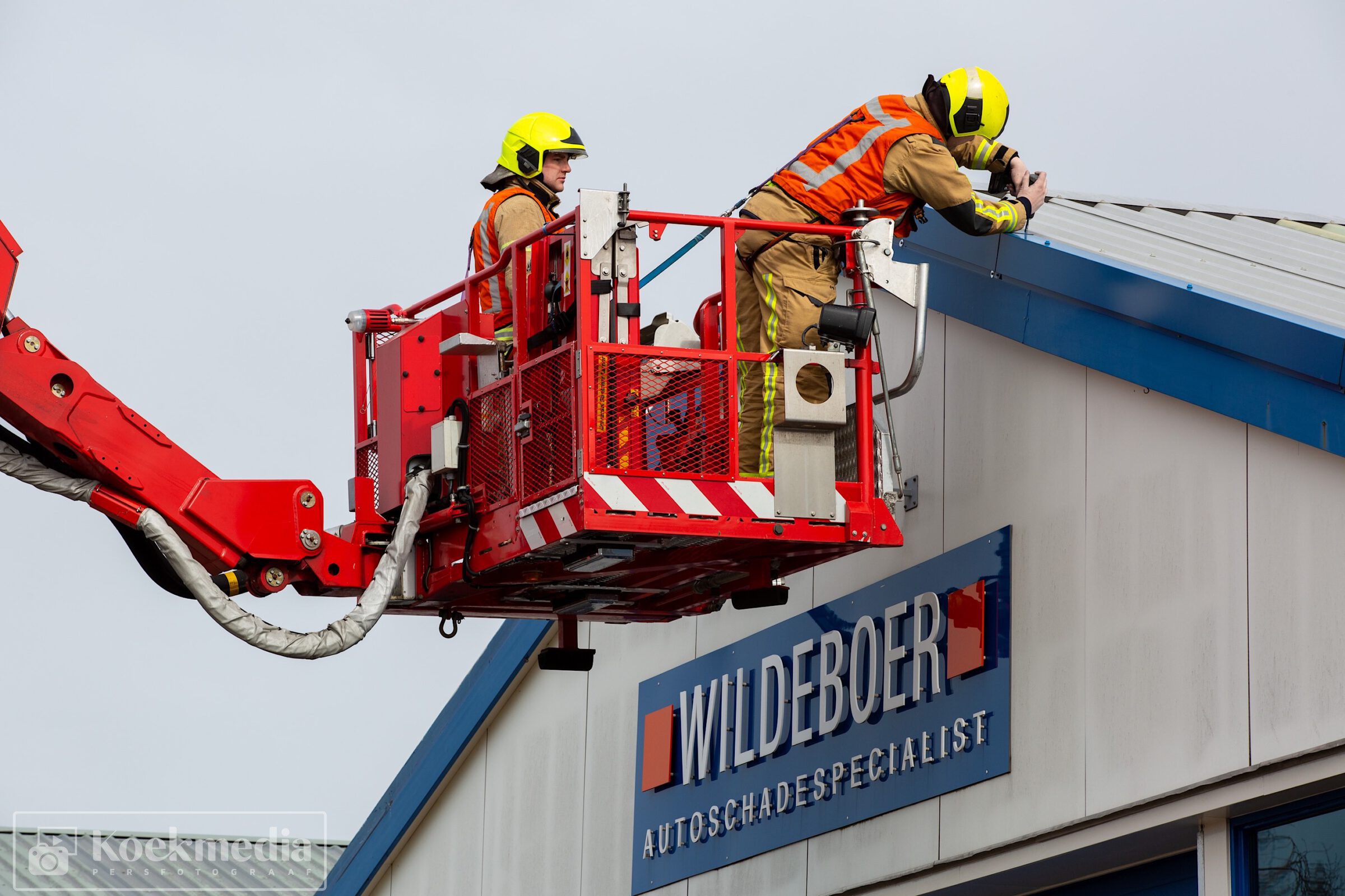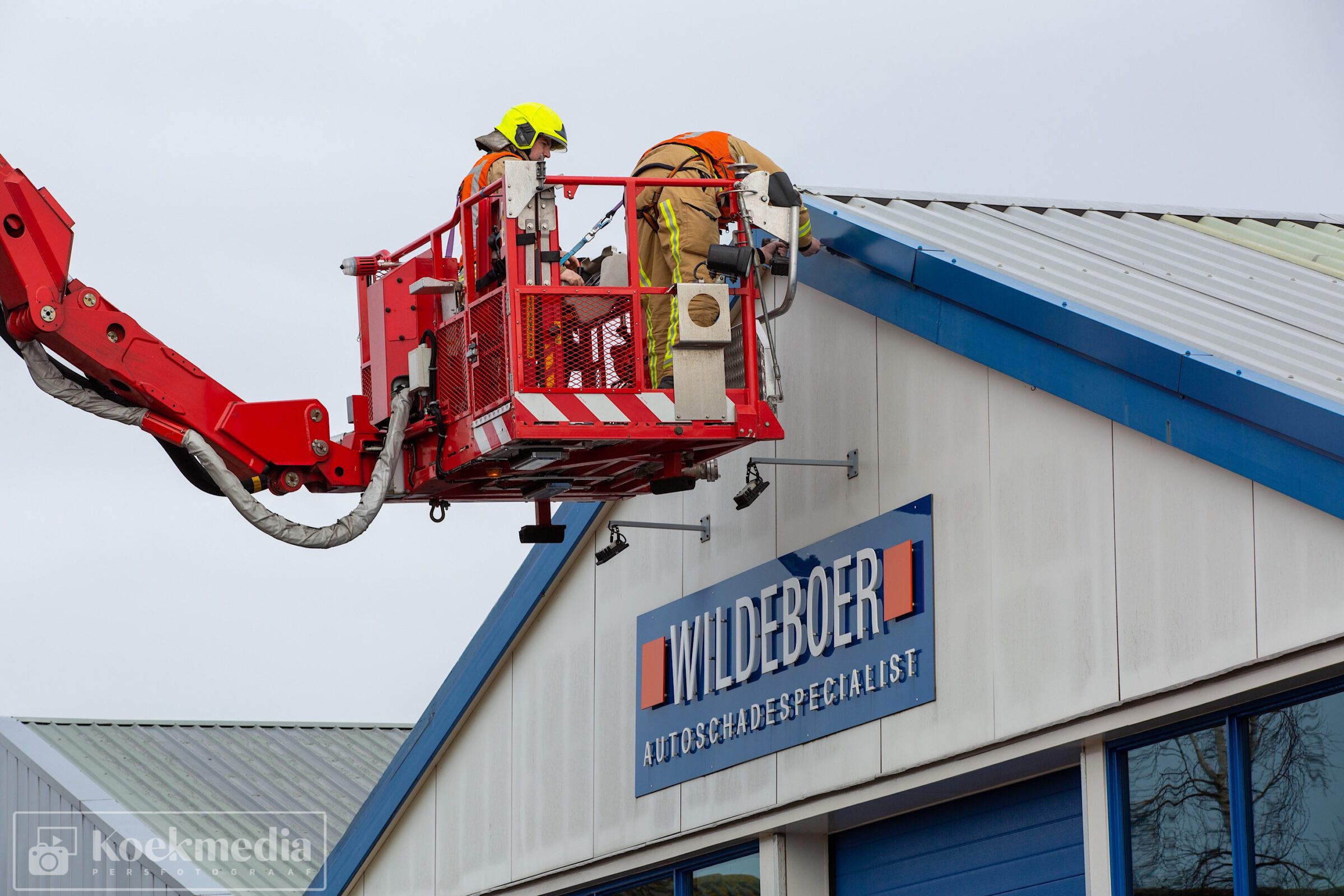 Bij een autoschade-herstelbedrijf aan het Ambacht liet de dakbedekking los. De brandweer heeft via de hoogwerker assistentie verleent om de dakplaten weer enigszins vast te zetten.