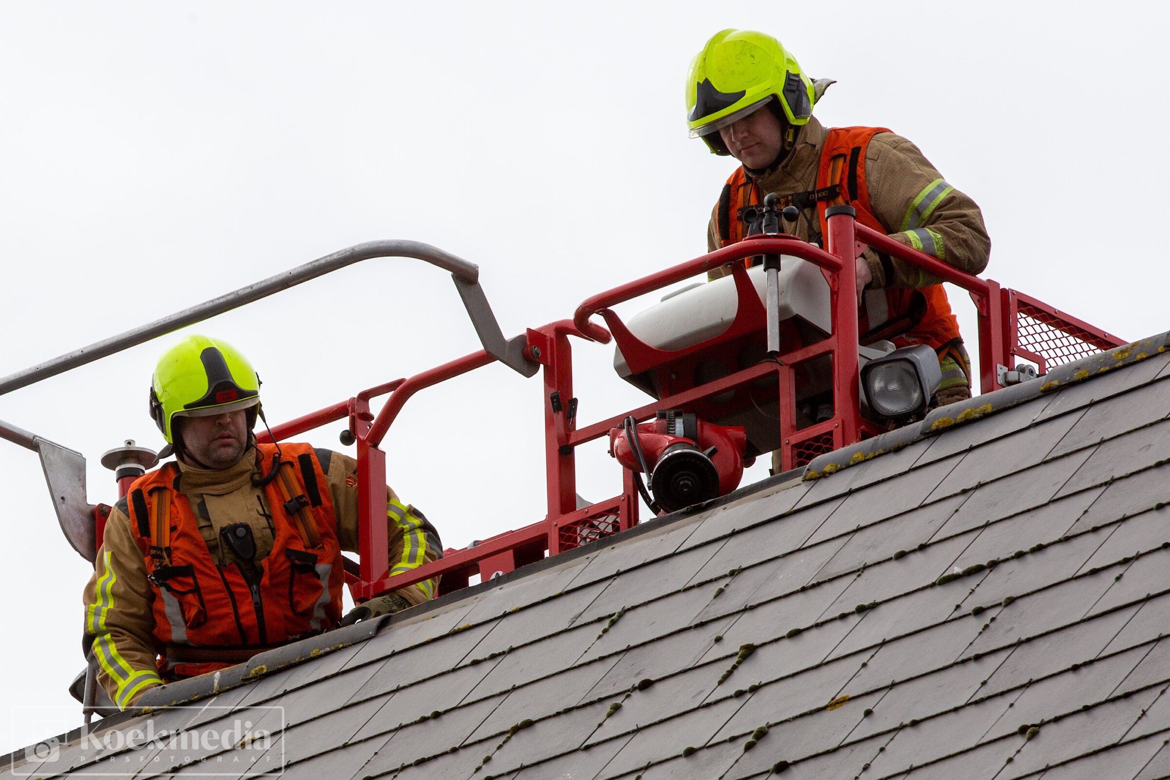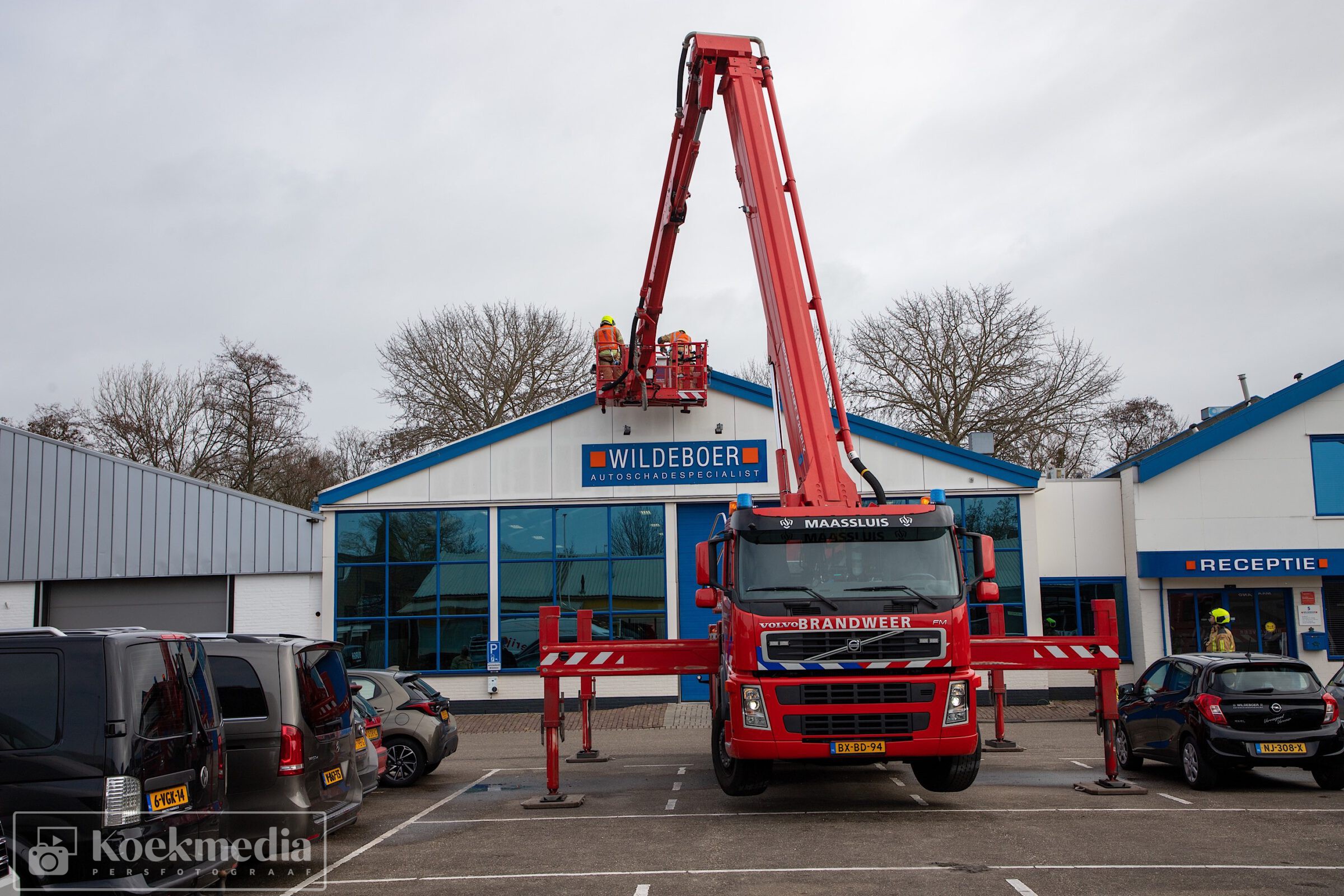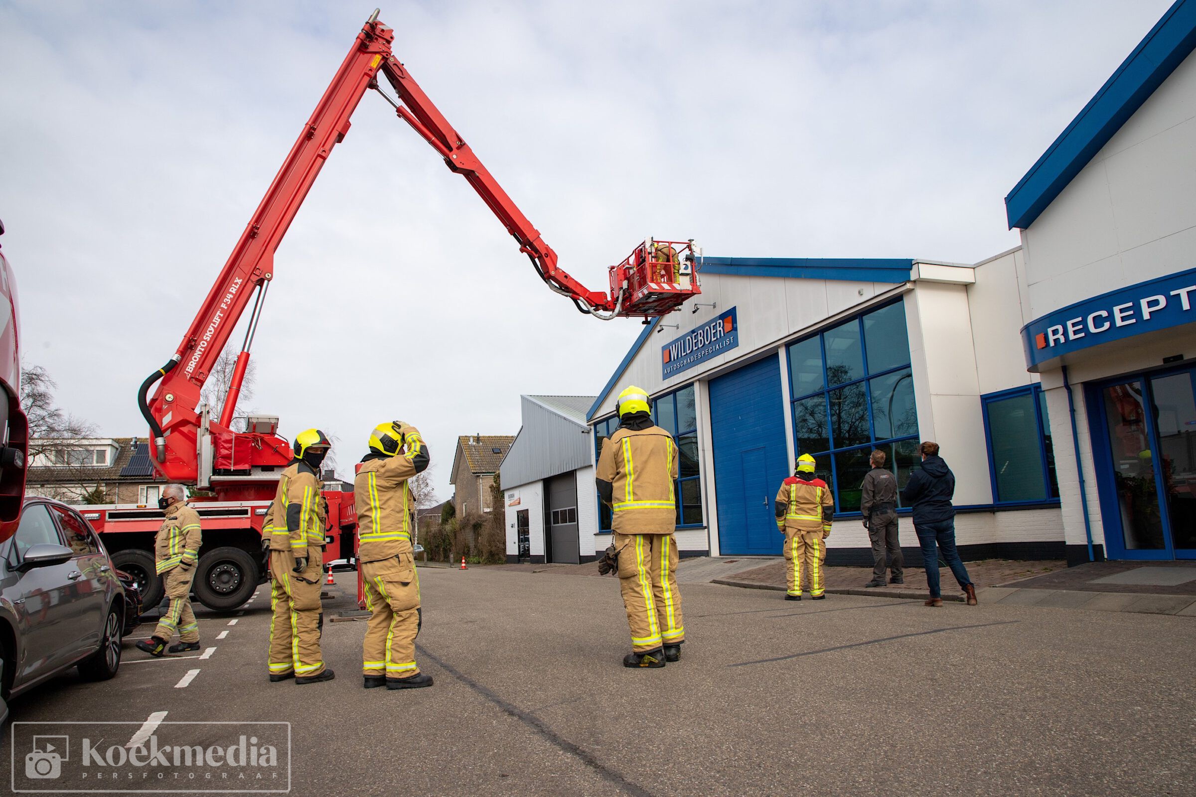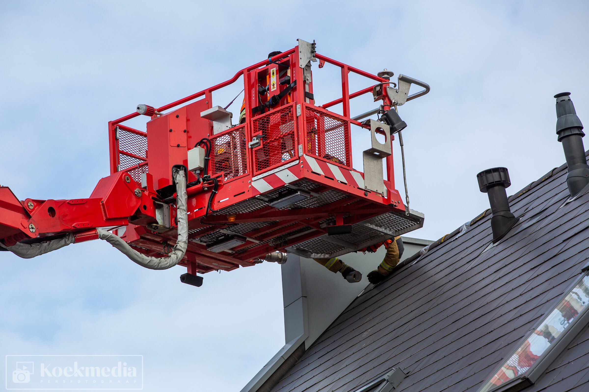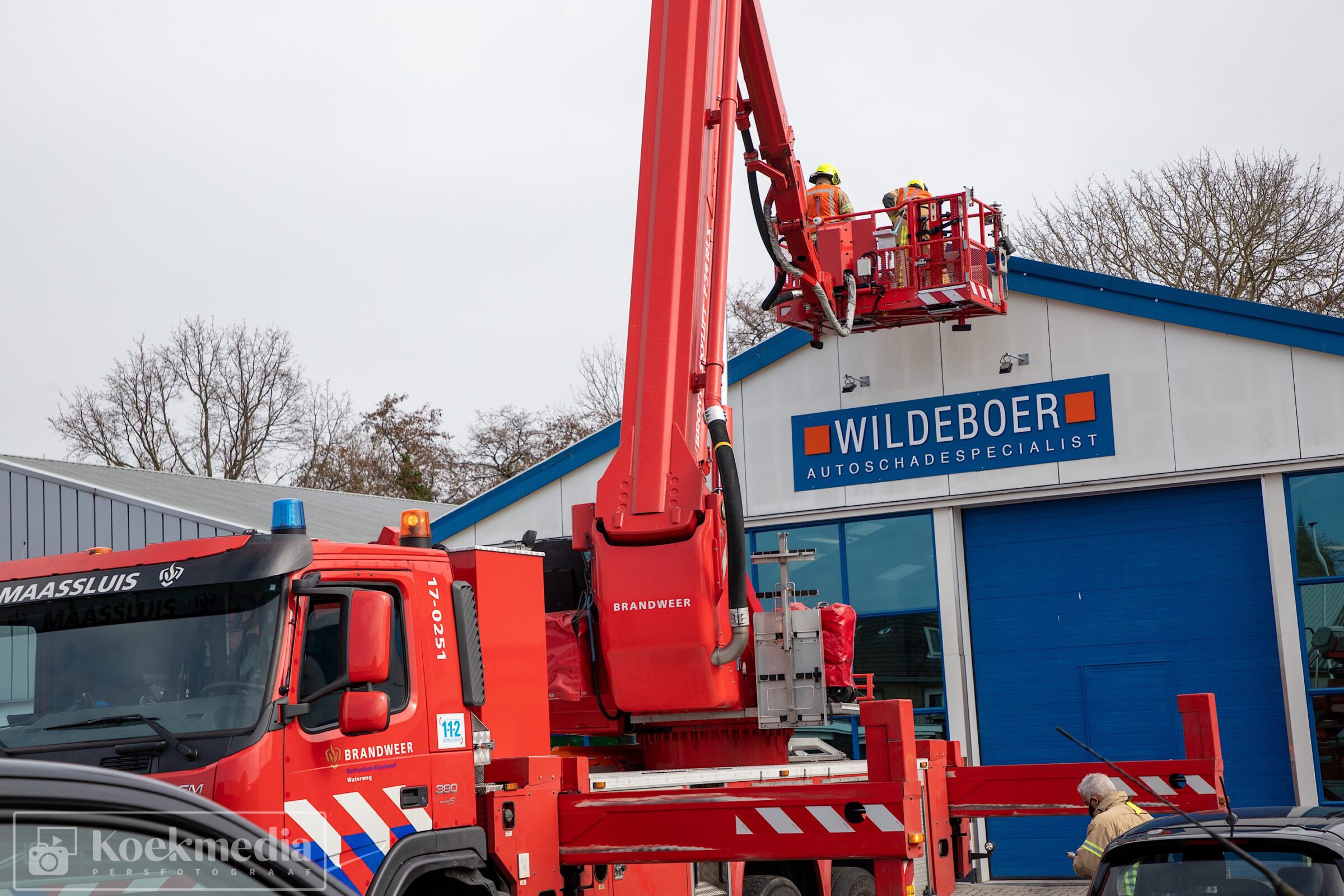 Bij een autoschade-herstelbedrijf aan het Ambacht liet de dakbedekking los. De brandweer heeft via de hoogwerker assistentie verleent om de dakplaten weer enigszins vast te zetten.