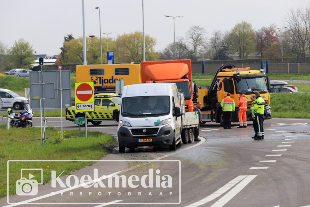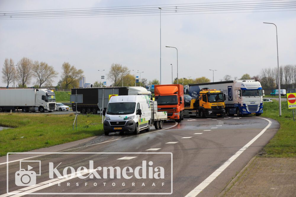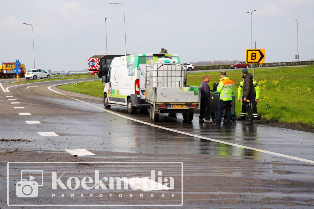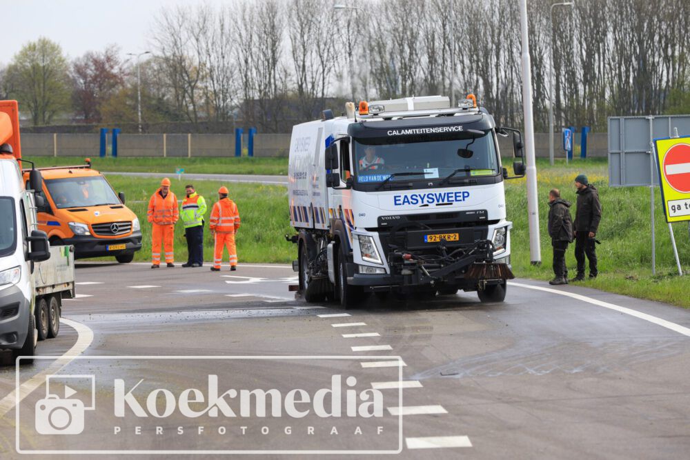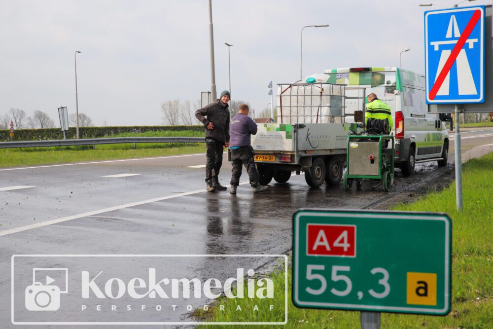 De lading diesel is hierbij over het gehele wegdek gekomen, Rijkswaterstaat en de politie hebben de afrit Den Hoorn/ Schipluiden/ De Lier afgesloten voor al het verkeer. De bestuurder van het busje en wat vrachtwagenchauffeurs hebben de plastic container en aanhangwagen weer rechtop gezet. De afgesloten afrit veroorzaakt filevorming richting Rotterdam en de Ketheltunnel. Een gespecialiseerd bedrijf zal het wegdek moeten schoonmaken, Rijkswaterstaat verwacht dat de afrit nog enkele uren gesloten zal blijven.