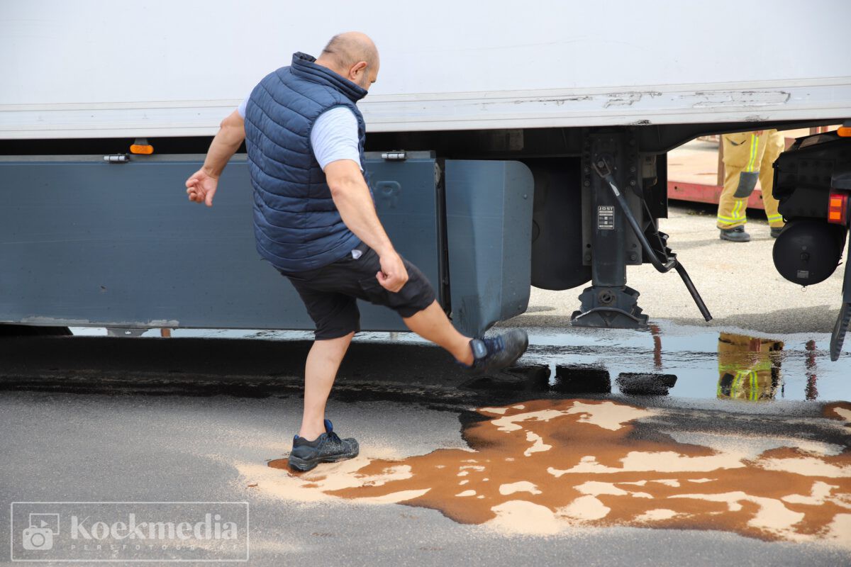 De dieseltank van de vrachtwagen werd geraakt en raakte lek, na pas enkele honderden meters kwam de chauffeur erachter dat er iets niet klopte aan zijn vrachtwagen. In zijn spiegels zag die een spoor van lekkage achter zijn vrachtwagen vandaan komen, en heeft toen de vrachtwagen aan de kant gezet. Omstanders hebben toen de brandweer en politie gebeld om te assisteren. De brandweer heeft met speciale absorptiekorrels de diesellekkage bedekt. De politie heeft na verdere inspectie van de vrachtwagen ontdekt dat er meer schade is dan alleen de dieseltank, en heeft de chauffeur met behulp van een tolk uitgelegd dat de vrachtwagen en zijn trailer in deze conditie niet de weg op mag en eerst gerepareerd moet worden. Medewerkers van het handelscentrum gaan de vrachtwagenchauffeur verder helpen met het afwikkelen van de schade. Het wegdek zal later op de dag professioneel gereinigd gaan worden.